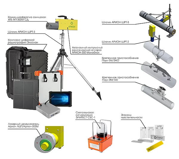 В комплексе «АРВИКОН» применяется легкий, компактный и простой в управлении импульсный рентгеновский аппарат АРИОН-300 в моноблочном исполнении. Моноблок предназначен для эксплуатации в полевых условиях, а также в условиях заводских цехов и лабораторий, когда требуется проведение радиографического контроля труднодоступных мест.