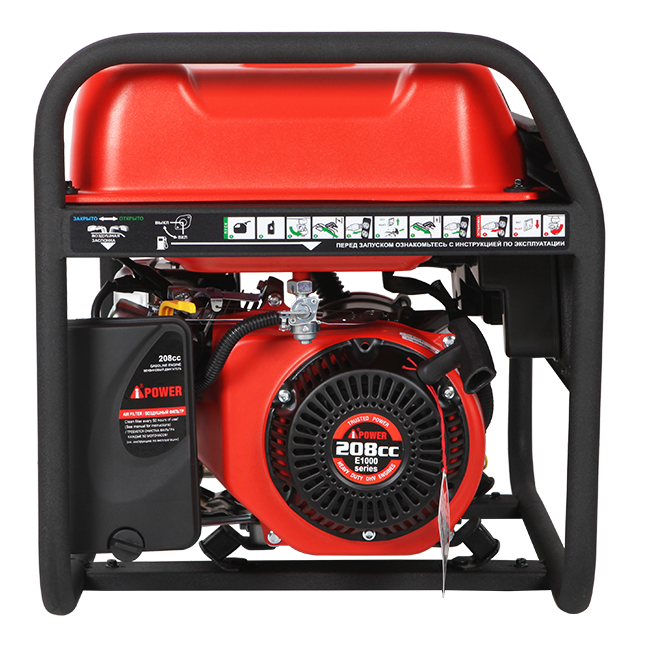 В основе бензинового генератора лежит 4-тактный двигатель с верхним расположением клапанов. Такая компоновка (OHV) повышает эффективность работы оборудования. Двигатель гильзованный, что упрощает его ремонт и положительно сказывается на сроке службы. Для запуска используется безотказный ручной стартер, которым, учитывая небольшой рабочий объем, легко пользоваться. Большой топливный бак объемом 25 литров обеспечивает отличную автономность.