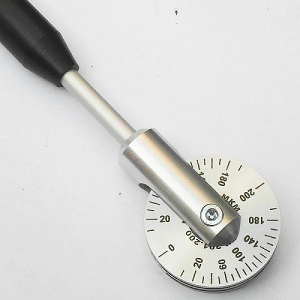 При прокатывании колесного толщиномера по сырому покрытию, на центральном ободе остается отпечаток покрытия. Толщина покрытия считывается по шкале в месте, где отпечаток покрытия заканчивается. Толщиномер мокрого слоя позволяет производить измерения как на плоских, так и на изогнутых поверхностях. Для использования в труднодоступных местах колесный толщиномер комплектуется рукояткой длиной 20 см.