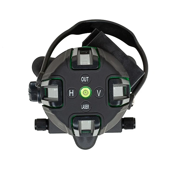 Нивелир проецирует пять линий: четыре вертикальных с развёрткой 120° и горизонтальную с углом в 110°. Вертикальные линии проецируются на 120° и заходят на потолок, формируя перекрестие над прибором. В сочетании с лазерным отвесом это позволяет использовать устройство для переноса точек по вертикали. Например, при разметке светильников. Управление осуществляется тремя кнопками: включения, переключения вертикальной и горизонтальной линий.