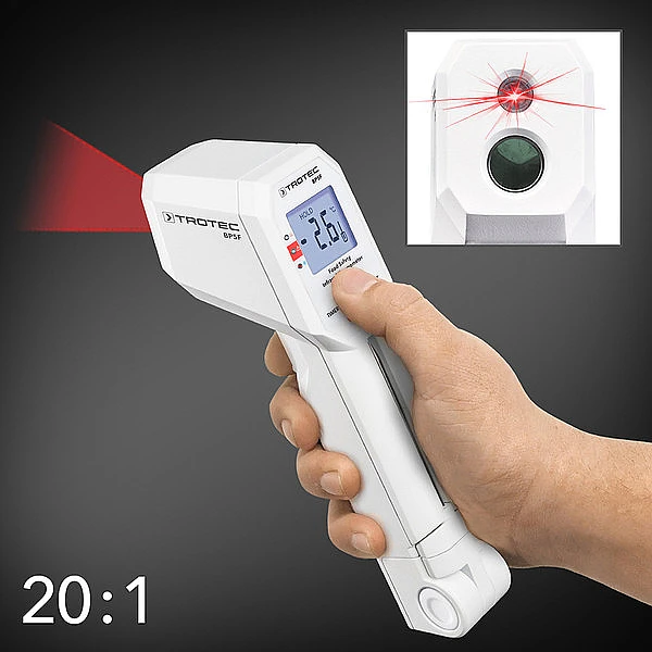 Менее чем через 1 секунду инфракрасный датчик определяет температуру поверхности и отображает ее большими цифрами на хорошо читаемом ЖК-дисплее с подсветкой. Температурный диапазон составляет от -40 °C до +280 °C. Для высоких температур инфракрасные измерения часто являются самым безопасным вариантом для предотвращения травм. Прибор имеет оптическое разрешение 20: 1. Чтобы лучше оценить поверхность измерения, BP5F проецирует пятно красного света на объект. Если в пятне измерения имеются разные температуры, будет определена средняя температура. Для получения наиболее точного результата измерение должно проводиться как можно ближе к объекту.